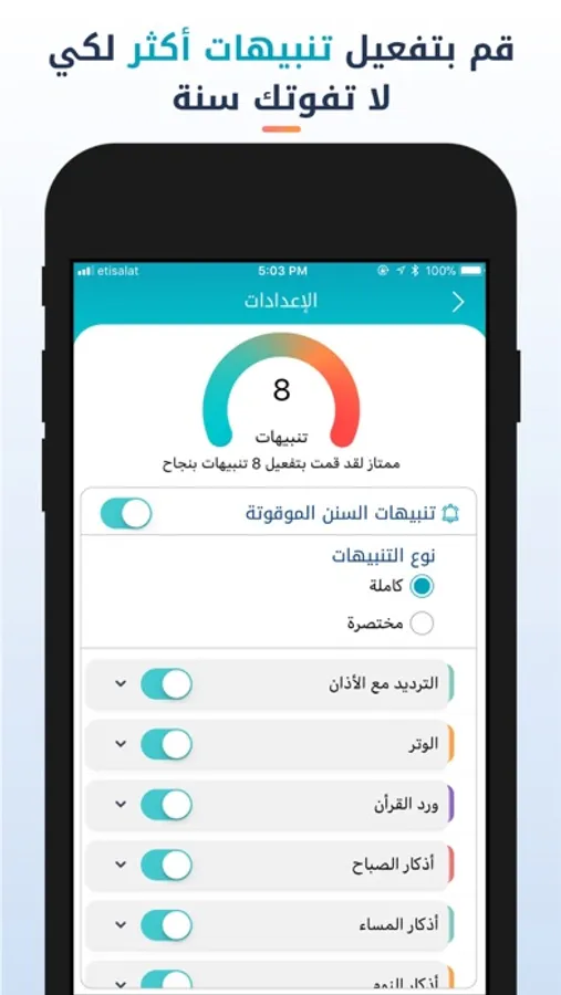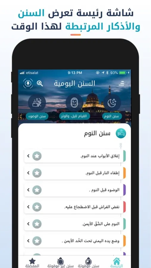 - شاشة رئيسة تعرض السنن والأذكار الموقوتة.