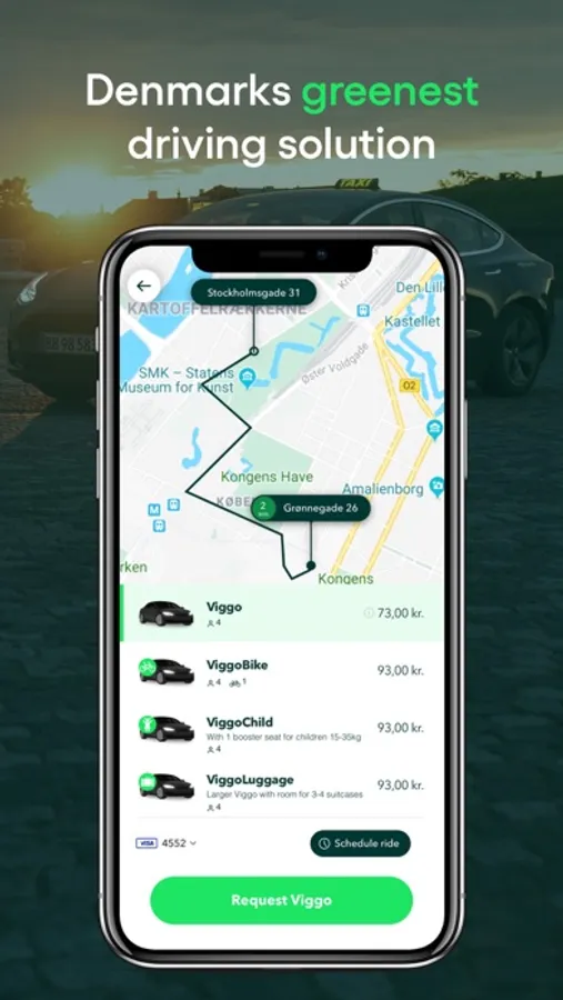 We are offering you an alternative to a fossil fuel-based taxi, so you can ride with less impact on the environment, without compromising on efficiency or price. Take a Viggo as your next taxi, when you need to get around in Copenhagen.