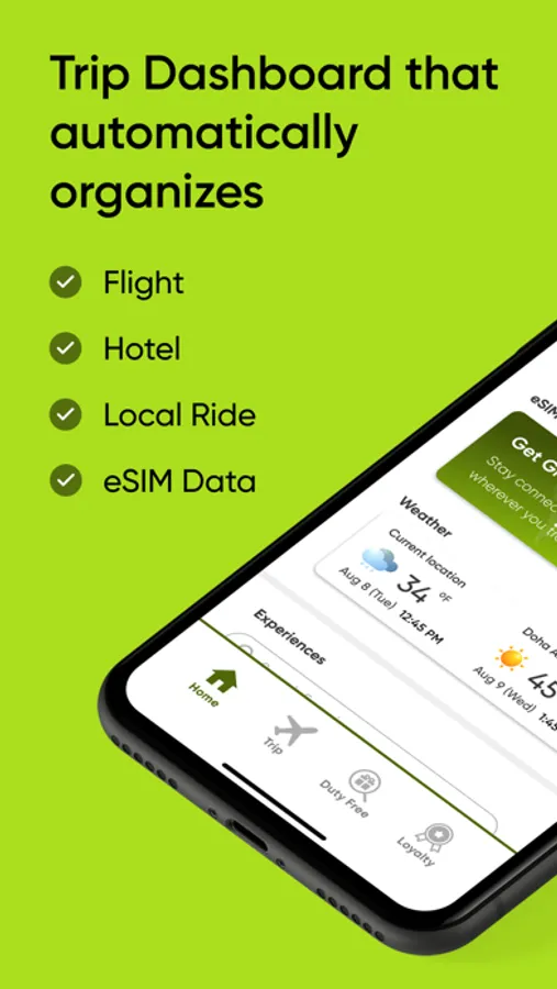 Streamline all travel logistics from departure to arrival in a single dashboard: from real-time flight updates, hotel & rideshare details, local time zone & weather info, and food recommendations.