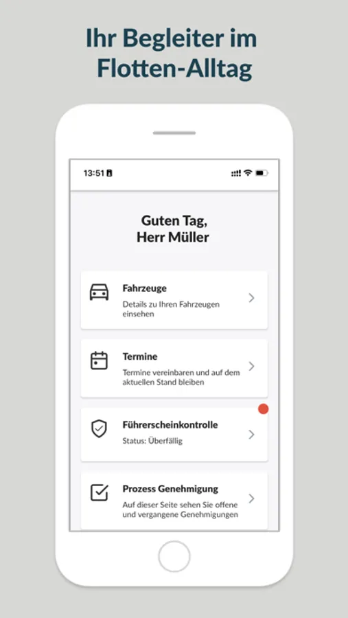 Für Fahrer: Wird Ihr Fuhrpark mit dem 360° ECO-System verwaltet? Nutzen Sie die App für Ihre Führerscheinkontrolle, um Daten zu Ihrem Fahrzeug einzusehen, Kilometerstände zu erfassen, Genehmigungen zu bearbeiten und z.B. Termine für Ihren Reifenwechsel zu buchen.