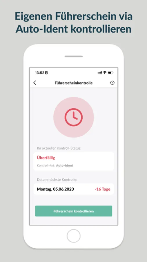 - Führerscheinkontrolle via Smartphone: Mit der von Ausweiskontrollen bekannten Methode Auto-Ident können sie nun auch selbstständig Ihre Führerscheinkontrolle durchführen, ohne dafür das Fuhrparkmanagement oder die Kontrollstation aufsuchen zu müssen. Ihre Führerscheinkontrolle – schnell und unkompliziert.