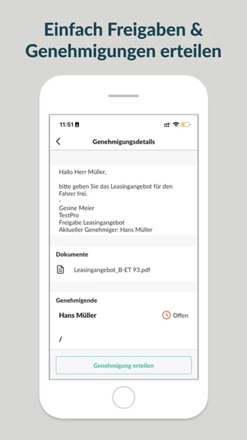 - Genehmigungen: Erteilen Sie Genehmigungen, die Ihr Fuhrparkmanager bei Ihnen anfragt, bequem über die App.