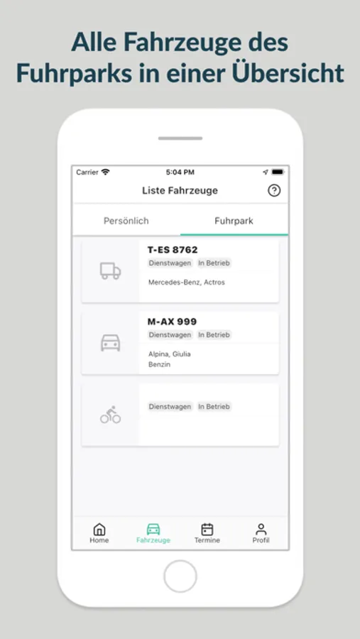 - Digitale Fahrzeugakte: Enthält alle Daten, Dokumente und Informationen rund um die Fahrzeuge (z.B. PKW, Fahrrad oder LKW) im Fuhrpark.