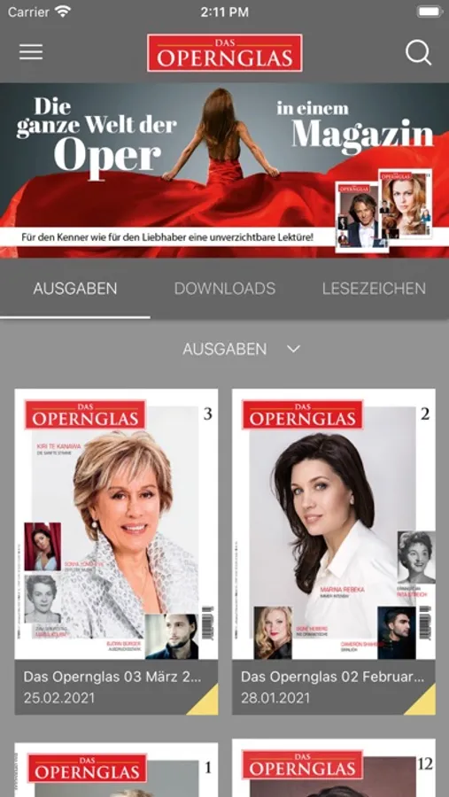 Die ganze der Welt der OPER in einem Magazin. Das monatlich erscheinende Fachmagazin DAS OPERNGLAS informiert kompetent und unabhängig aus der nationalen und internationalen Opernszene. Die unverzichtbare Lektüre für den Kenner wie für den Liebhaber; gleichermaßen informativ wie unterhaltsam. Ein Markenzeichen: Die Interviews. Ausführliche Gespräche mit den aktuellen Stars der Bühnen, den Talenten von morgen, den großen Opernlegenden, mit Dirigenten, Komponisten, Regisseuren, Intendanten. Alle wichtigen Premieren der großen Bühnen in Berlin, München, Hamburg, Wien, London, Paris und New York. Dazu die ganze Vielfalt der deutschen Opernlandschaft, sowie ausführliche Berichte zur internationalen Festspielszene – von den Zentren Bayreuth und Salzburg bis zu den Arenen und Seebühnen in ganz Europa. Aktuelle Sonderthemen weltweit bieten spannende Blicke über den Tellerrand. Weitere redaktionelle Säulen sind die Vorstellung von Neuheiten im Medienbereich, ausführliche Künstlertermine, detaillierte Vorschauen auf die Pläne der Opernhäuser und Festspielveranstalter, Monatsspielpläne, TV-Tipps und vieles mehr. 11 Ausgaben im Jahr (1 Festspiel-Doppelausgabe im Juli/August).