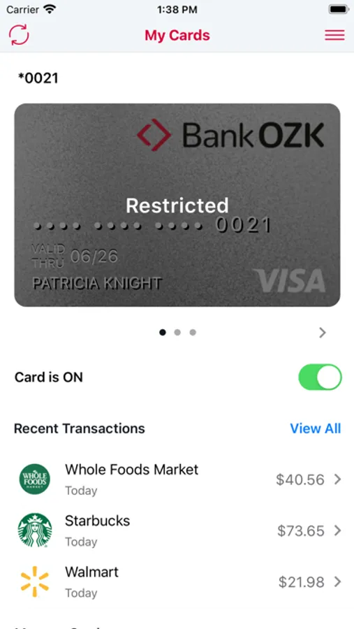 Bank OZK Cards helps you protect your Bank OZK debit cards by sending you transaction alerts and giving you the ability to define when, where and how your cards are used. Simply download the Bank OZK Cards app to your smartphone, then customize your alert preferences and usage settings to monitor and manage your cards.