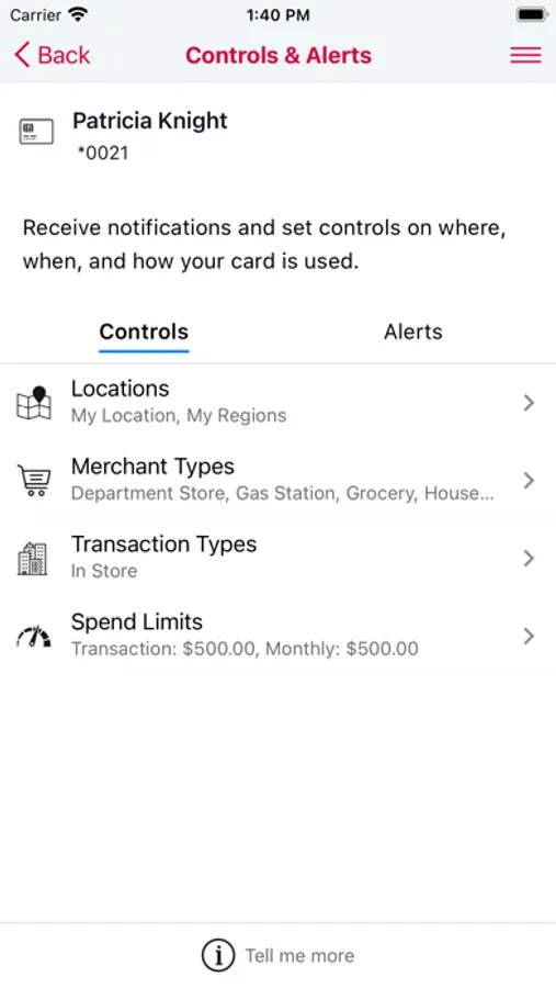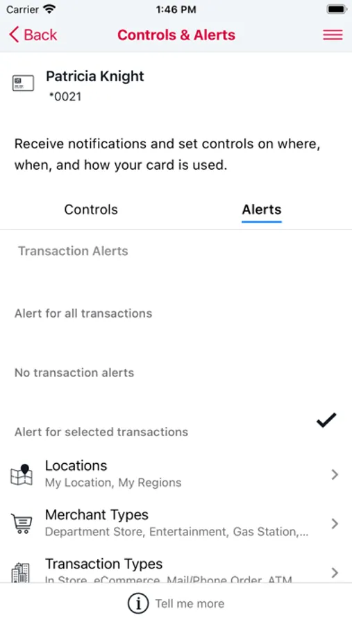The My Location control can restrict transactions to merchants located within a certain range of your location (using your phone’s GPS); transactions requested outside of the specified range can be declined. The My Region control uses city, state, country or zip code on an expandable interactive map; transactions requested by merchants outside of a specific region can be declined.