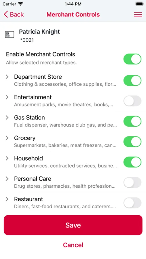 Spending limits can be established to allow transactions up to a certain dollar value and decline transactions when amounts exceed your defined thresholds. Transactions can be monitored and managed for specific merchant categories such as gas stations, department stores, restaurants, entertainment, travel and groceries. And your transaction types: in-store purchases, e-commerce transactions, mail/phone orders and ATM transactions.