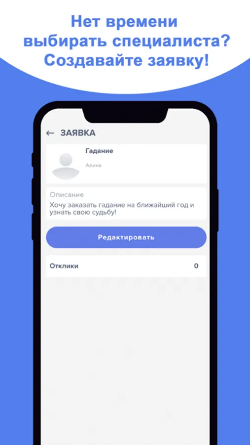 Если вам не хватает времени на поиск подходящего специалиста, вы можете создать заявку на консультацию, указать интересующее направление, описать свой вопрос и выбрать специалиста из тех, кто откликнулся на вашу заявку. Удобные уведомления с возможностью отключения будут напоминать вам о новых откликах. Обсудите все детали и договоритесь о встрече в чате.