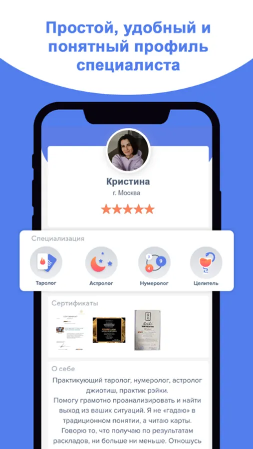 Для специалистов мы создали простой и удобный профиль, где вы можете указать свою специализацию, описать свою деятельность и загрузить дипломы и сертификаты. Вы можете выбрать подходящую заявку клиента на консультацию, откликнуться на нее и перейти к обсуждению деталей встречи, либо отвечать на вопросы клиентов в чате. Удобные уведомления помогут вам не пропустить и оперативно отреагировать на обращение клиента, а также сообщат о новых заявках на консультацию.