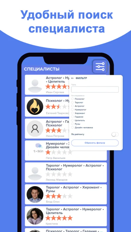 Для клиентов мы создали простой и интуитивно понятный интерфейс. С помощью удобного фильтра можно выбрать специалиста по интересующей специализации, городу или рейтингу. Если у вас есть сомнения в квалификации специалиста, вы можете изучить его профиль, где можно найти сертификаты, дипломы, рейтинг и отзывы других клиентов. Вы также можете задать уточняющие вопросы в чате.