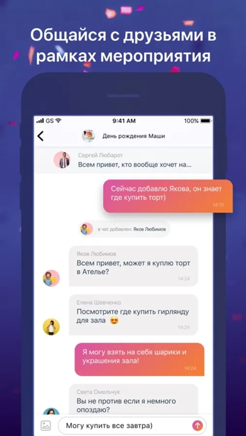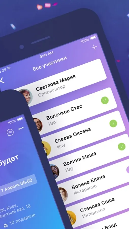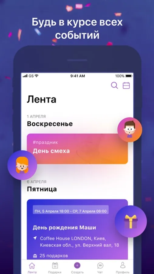 Приложение позволит не только организовать свой праздник, но и побывать на главных событиях города! Достаточно указать увлечения — программа подберет ивент по интересам и предложит посетить. Все встречи заносятся в умный календарь, так, что ты ничего не пропустишь!
