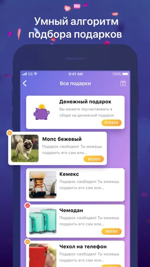 Именинник может выложить вишлист не просто списком, а конкретным перечнем подарков, которые можно приобрести и оплатить сразу в приложении