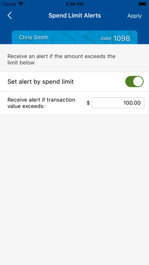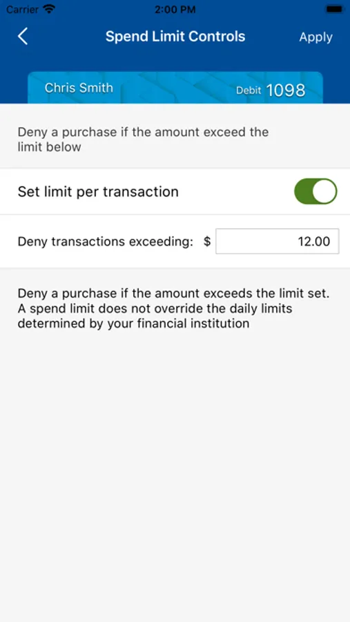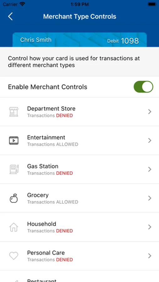 Set spending limits to decline transactions above your thresholds. Monitor activity by category such as gas stations and restaurants, and by type: in-store purchases, e-commerce transactions and ATM transactions.
