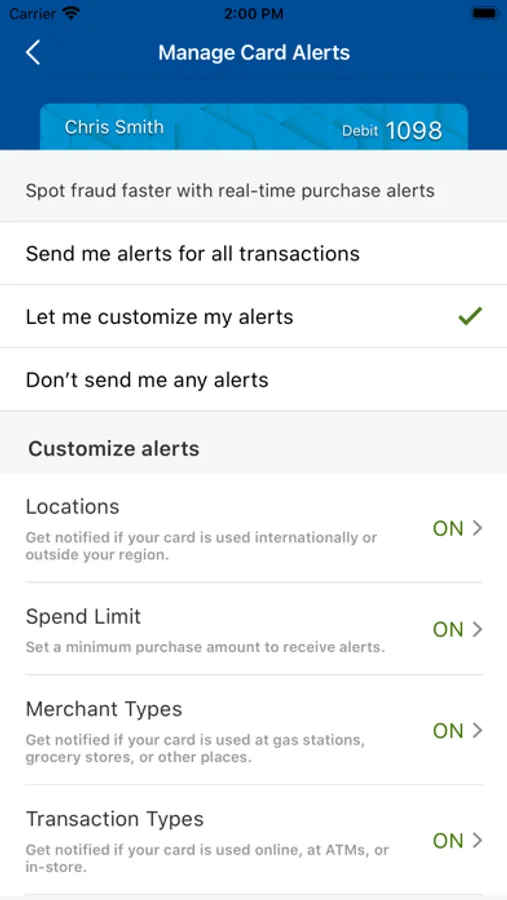 Real-time alerts for PIN and signature transactions keep you informed of your card usage to quickly detect unauthorized or fraudulent activity.