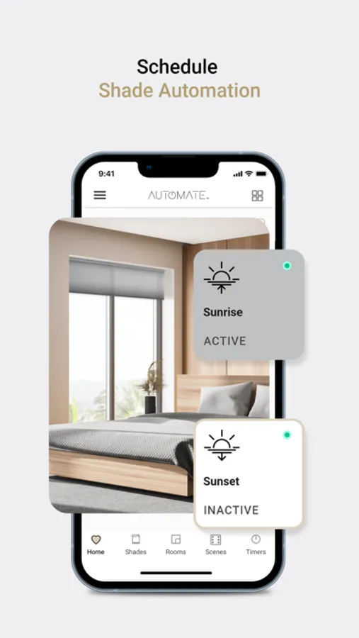 Personalize shade control and organise how your shades operate by specific daily events or scenes automatically at the optimal time. Creating a scene for your entire home can be completed effortlessly with a Scene capture button.