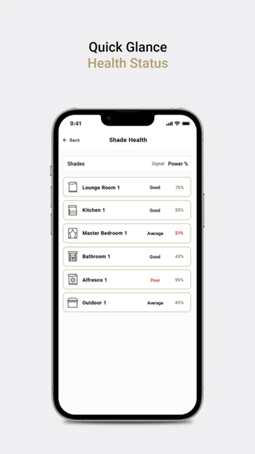 Quickly view the Health Status of all your shades. A summary screen displays the battery levels of all your shades along with signal strength indicators, prompting necessary action to either charge your motors or troubleshoot connections.