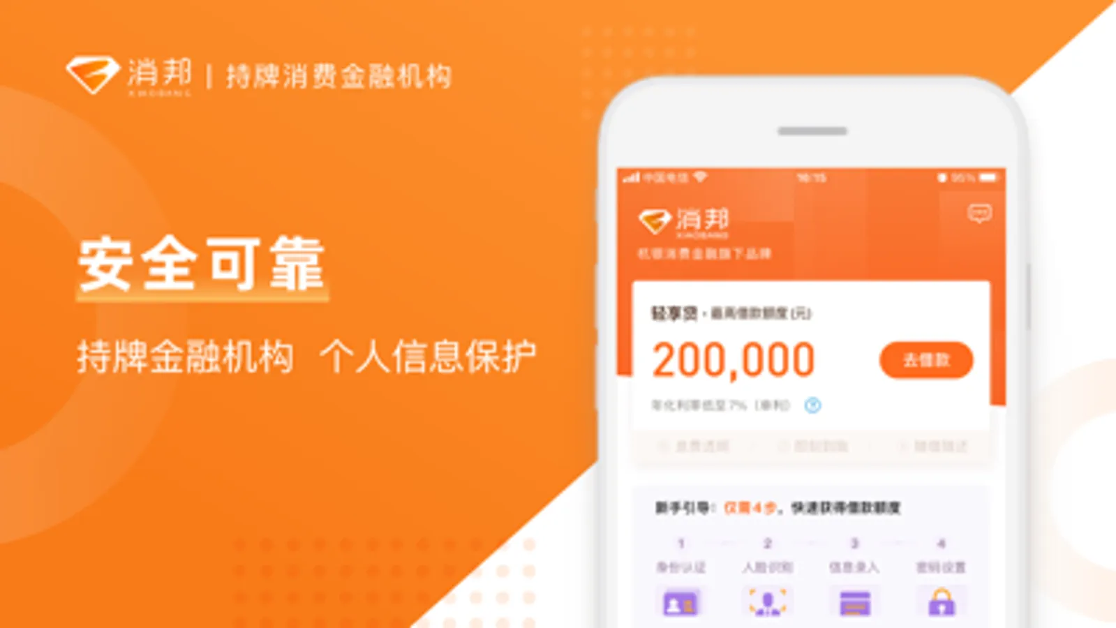 消邦App是杭银消费金融股份有限公司官方推出的一款信用贷款产品,提供安全、智能、便捷的消费信贷服务:凭身份证即可在线申请,额度高至20万元。