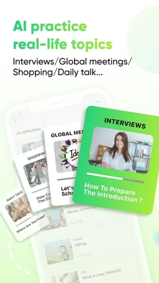 AI practice with real-life topics: Interviews, global meetings, shopping, study, daily talk, and more. You can USE what you have learned.