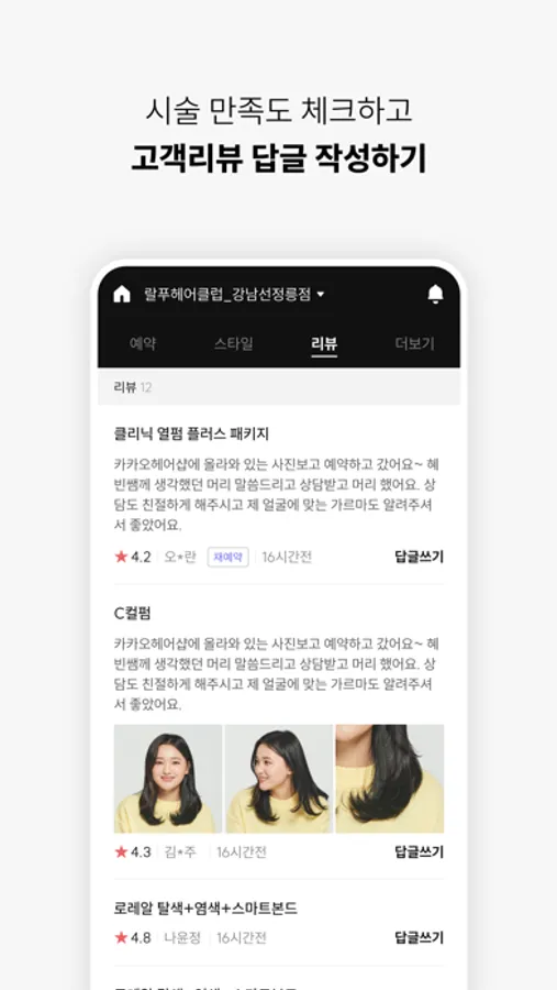 리뷰 관리 기능을 통해 고객의 시술 만족도를 체크하고, 리뷰 답글도 작성할 수 있습니다.