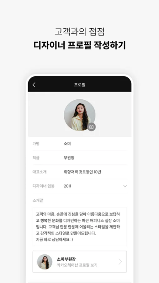 카카오헤어샵에 노출되는 디자이너 소개 정보를 빠르게 수정할 수 있습니다.