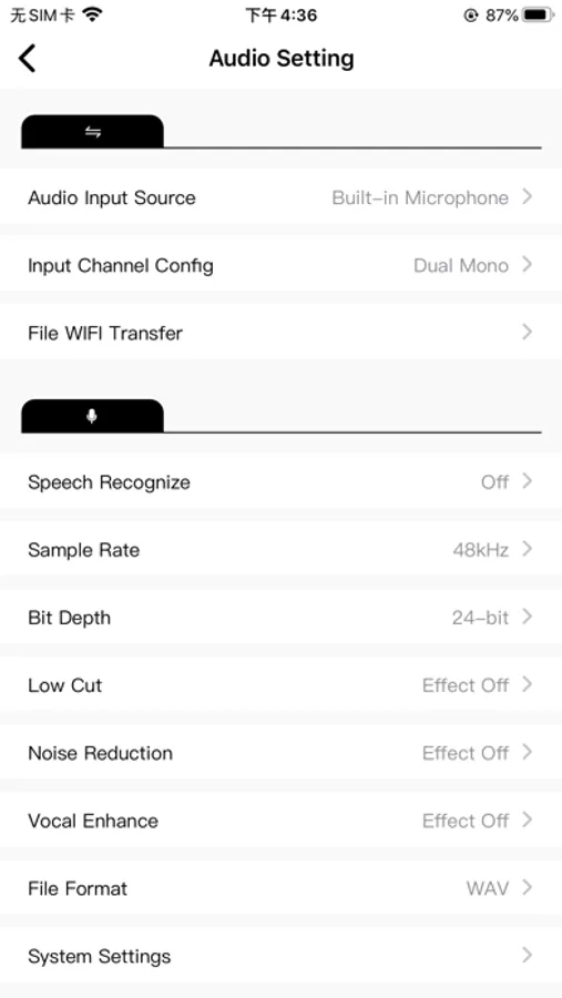 【Sound effect processing】You can enable noise reduction, low cut, vocal enhancement and other sound effects in the APP for audio and video recording, and set related parameters