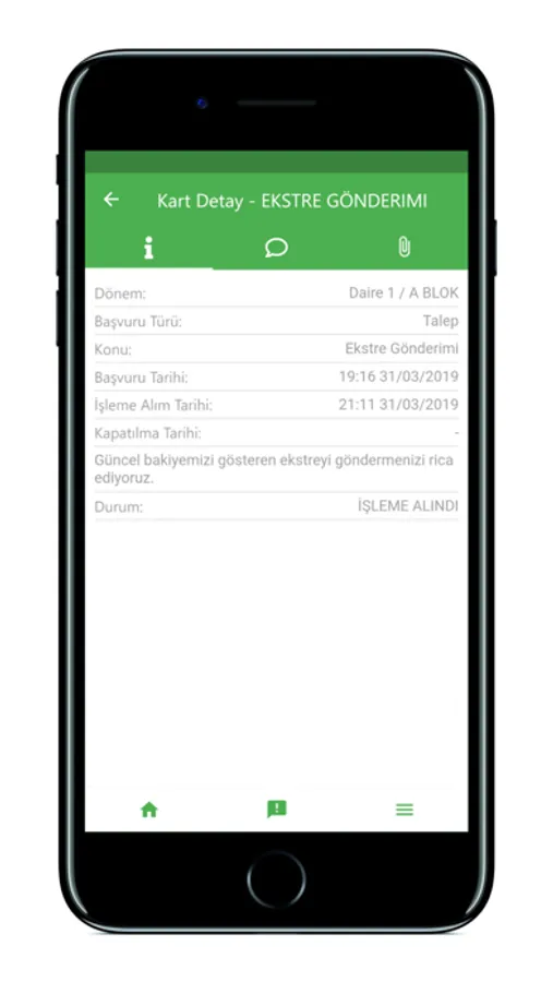 Yönetiminize iletmek istediğiniz şikayet, öneri ve taleplerinizi uygulama içerisinden anında gönderebilirsiniz. Yönetiminize ilettiğiniz başvuruların durumlarını takip edebilir, yönetim ile doğrudan iletişime geçebilirsiniz.