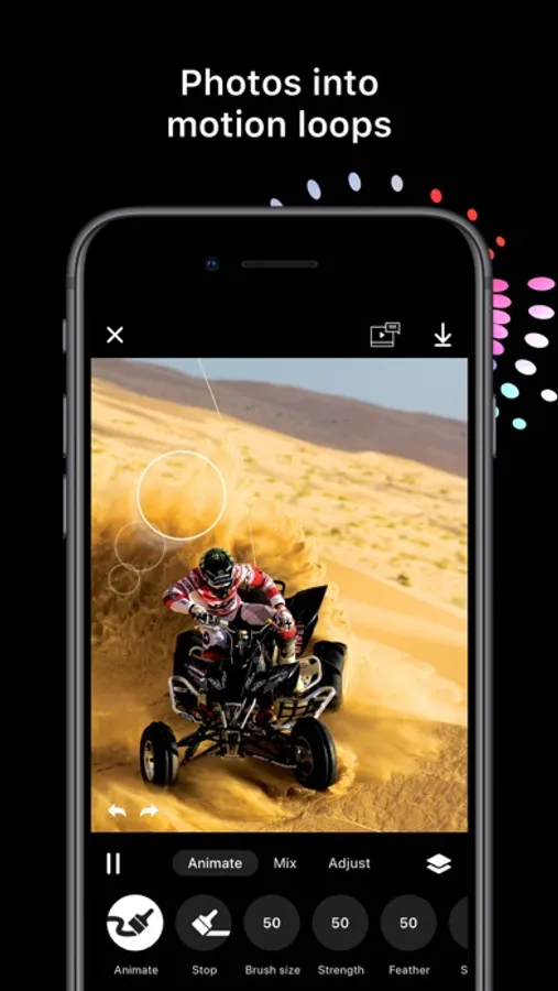 То create motion in an image just paint the area you want in the direction you want it to move. To stop an animation just paint over it with the stop brush. It’s that simple. No anchors, no points, no arrows.