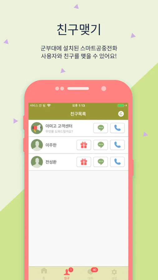 스마트 공중전화기를 사용하는 지인과 영상/음성 통화 및 문자 대화서비스를 이용할 수 있습니다.