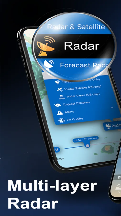 The Weather Forecast app has multiple detailed metrics like temperature, humidity, pressure, snow, clouds, rain and wind. It's all present on our main screen, alongside precise real-time 30+ radar layers to choose from.