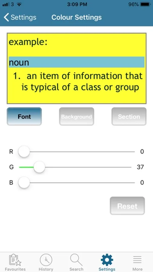 • Favourites, allows you to easily add words to a list of favourites and review previously selected words.