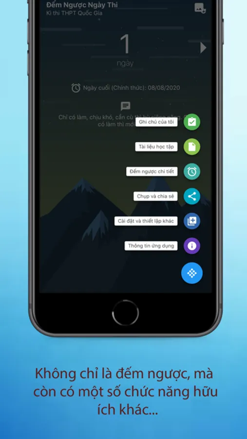 Chức năng chính của ứng dụng này là đếm ngược thời gian cho đến ngày thi quan trọng nhất trong 12 năm cắp sách đến trường ”KÌ THI TỐT NGHIỆP TRUNG HỌC PHỔ THÔNG”