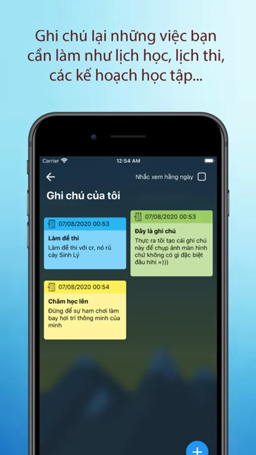 + Chức năng ghi chú giúp ghi lại kế hoạch cũng như các việc cần làm trong tương lai để tránh bị quên, phục vụ cho việc học tập như ghi lại lịch đi học thêm này, ghi chú học hành...