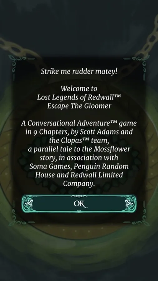 One of a series of six games, The Lost Legends of Redwall: Escape the Gloomer, is created in partnership with Soma Games under license from Penguin Random House UK™ and the Redwall Abbey company™. The Lost Legends of Redwall: Escape the Gloomer is a Conversational Adventure™ game in nine chapters developed by Team Clopas.