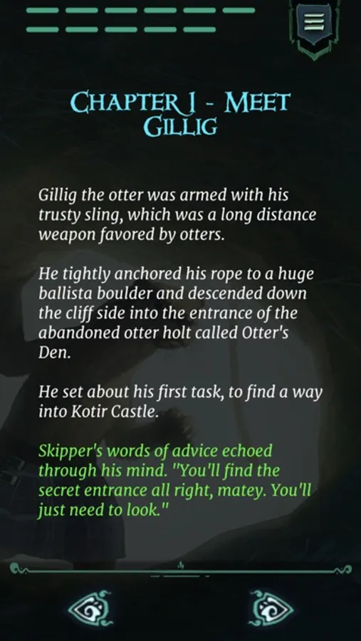 Now our would be champion, Gillig directed by the otter leader Skipper, has been given a very special solo mission. Retrieve an ancient scroll once belonging to Verdauga. On the verge of being exiled from the otter crew, Gillig sees this as an opportunity to prove himself to the otter tribe – if he can overcome his weaknesses.
