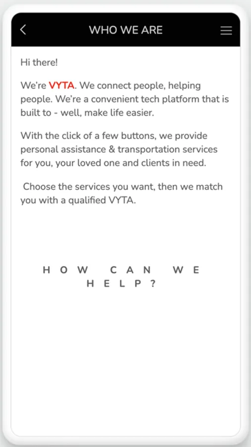 VYTA provides personal assistance, care & transportation services for you, your loved one and clients in need, in one simplified platform. How can we help you today?
