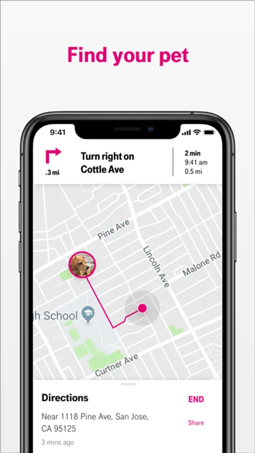 • View your pet’s location on a virtual map and receive turn by turn directions straight to them.