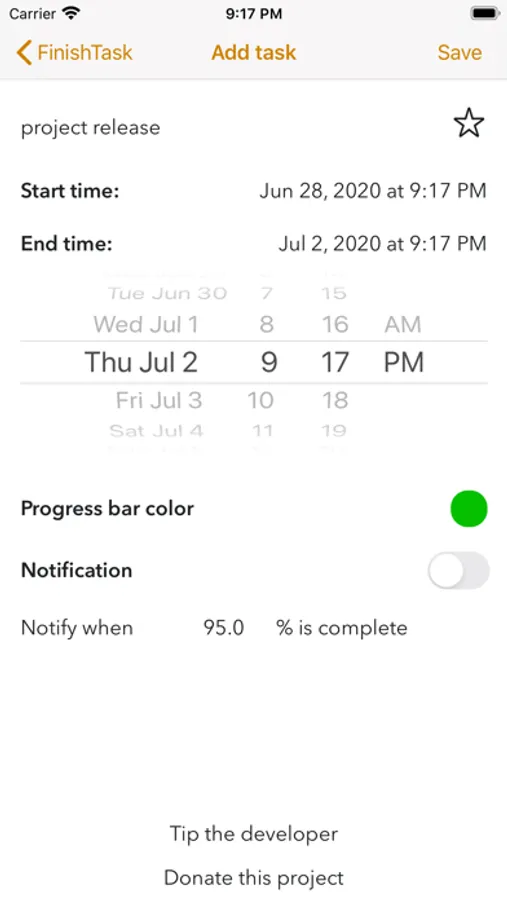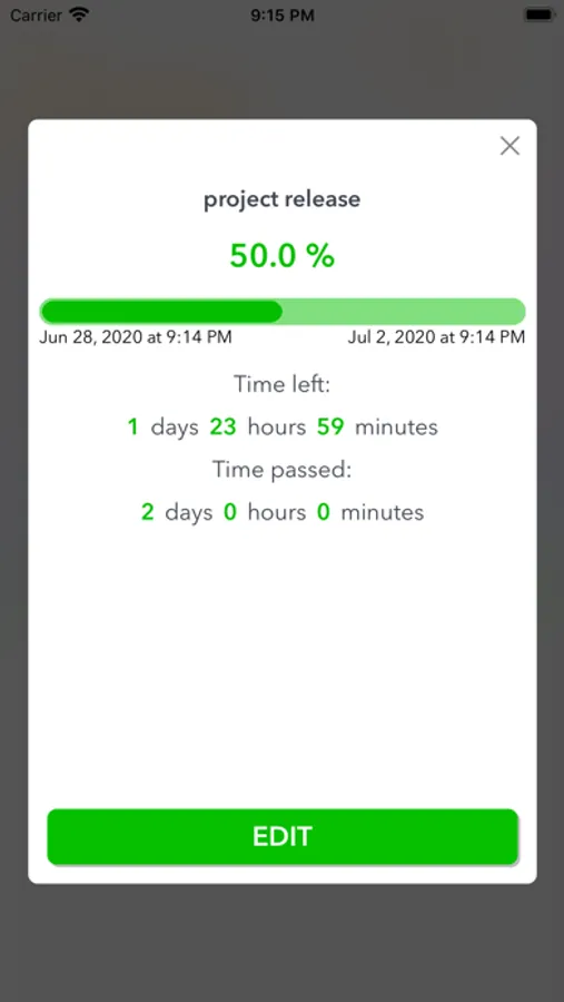 By clicking on any set goal, you will see the remaining number of days, hours and minutes, as well as a gradually filled-in scale with the display of elapsed time in percentage terms.