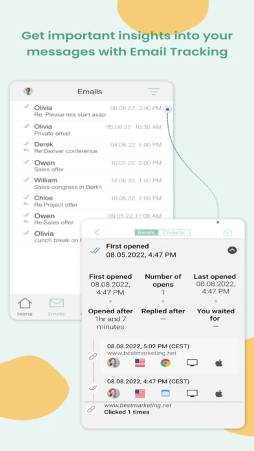 • Email Tracking: More information needed? Send tracked emails from your mobile phone and use the app to find out when, where, and how often your email or link was opened