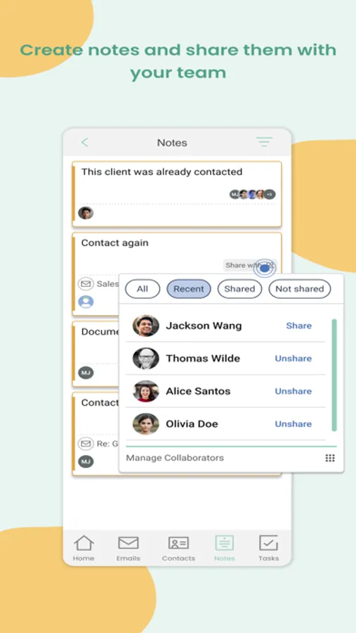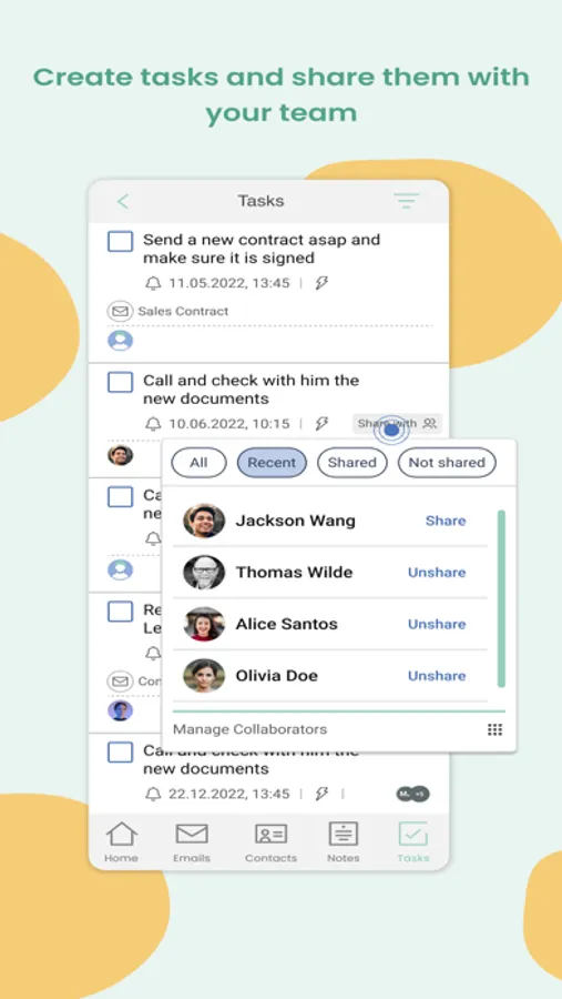 • Collaborators: Be consistent. Share contacts, notes, tasks, signatures, templates and more across your whole team