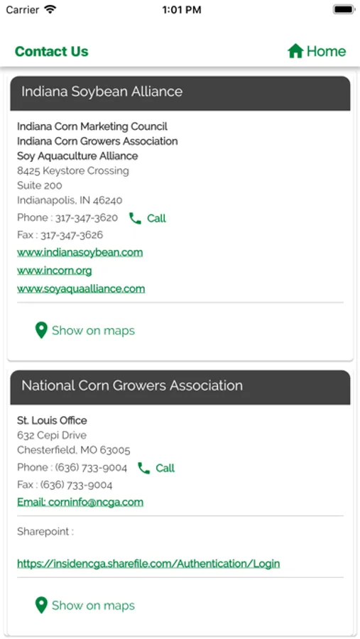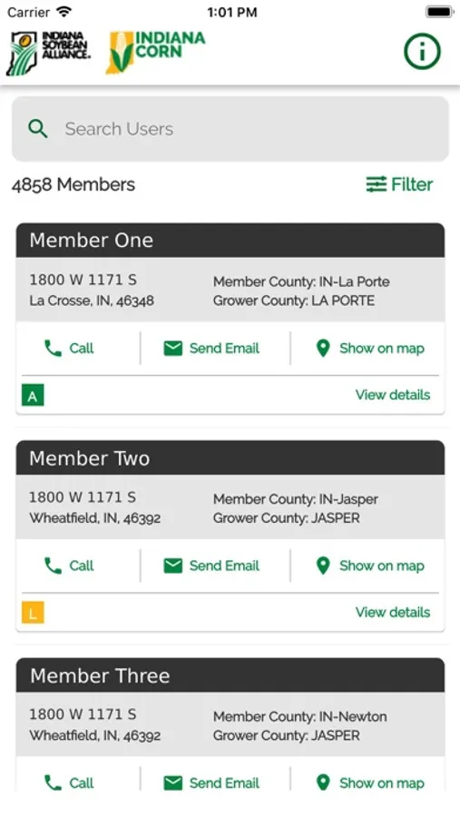 INfarms is the mobile app for representatives of the Indiana Corn and Soybean Associations. The app allows representatives to access member data and details while in the field. This apps assists reps with their daily activities with tools such as contacting members by email, phone, gps etc.