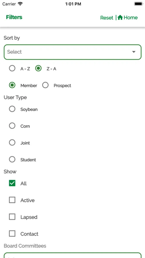 Users can filter the member list using a variety features including Member Types, Districts, Board Committees, etc.