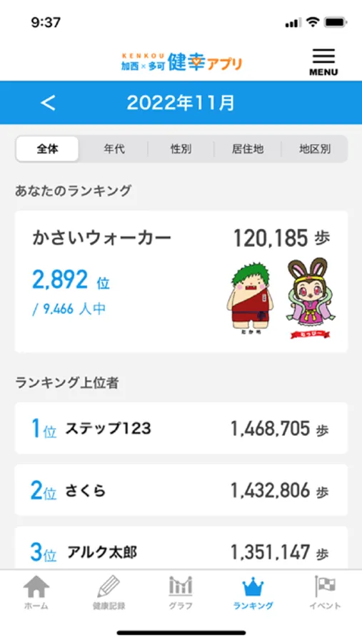 ⑤アプリ内の歩数ランキング(全体・年代・性別・居住地別・地区別)