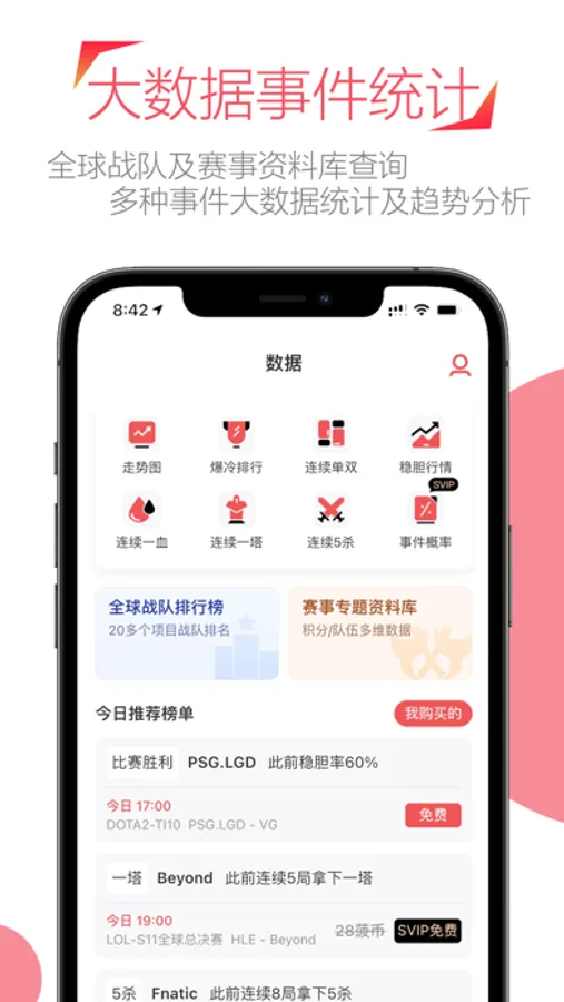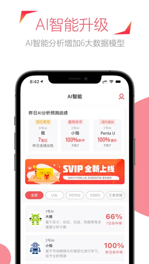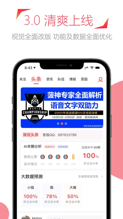 AI推单采用自研的大数据分析算法,精准预测当日电竞赛事的局势分析及走势,分析预测当日比赛胜负。
