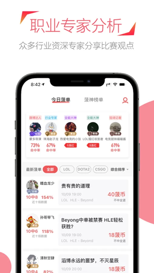 专家推荐栏目入驻了众多电竞圈内专家,包括职业战队教练,退役选手,数据分析师等等专业大咖,分享比赛看法观点,与用户交流比赛心得。