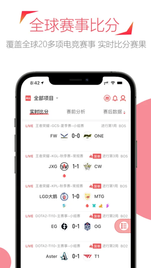 专业的电竞赛程比分数据,实时提供全球每日数百场电竞赛事比分,实时数据展现了比赛实时经济,装备,状态,眼位,击杀,助攻等KDA详细数据。同是提供实时数据对比分析。赛前赛后对阵分析。