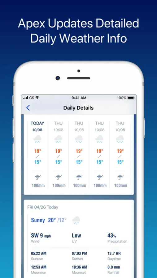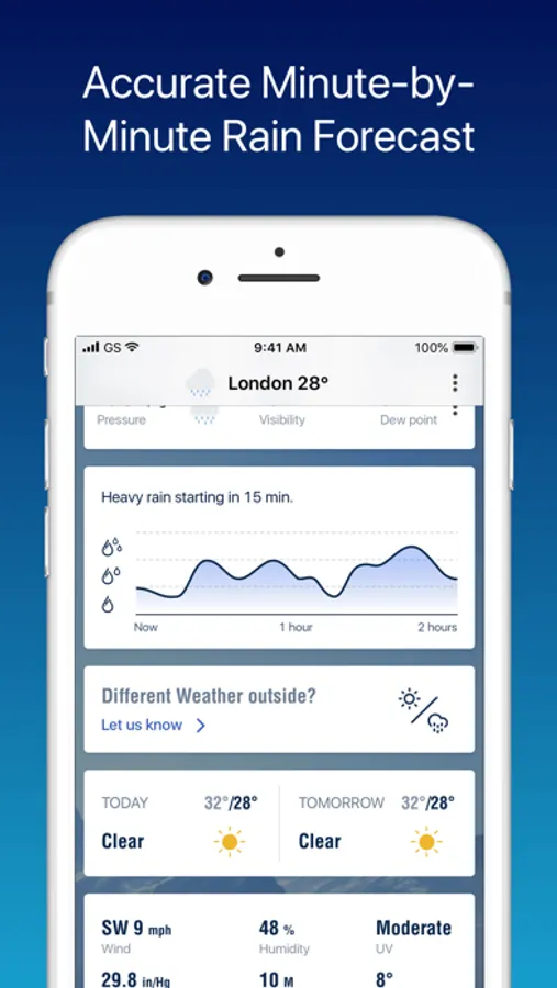 Never get caught in the rain again! Apex Weather now offers powerful minute-by-minute rain predictions to your precise location for the next hour so that you can be wisely prepared before stepping out. Take a glance and the weather is in the palm of your hand now!