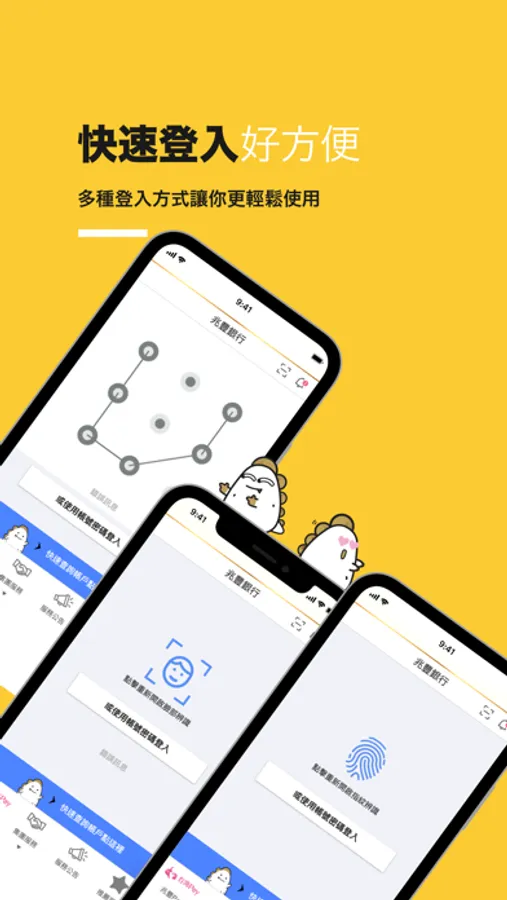 利用指紋、臉部或圖形密碼驗證,免輸入帳號密碼,即快速登入App。