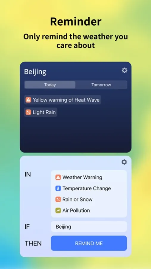 "Remind me if it rains in Beijing", a weather forecast set up exactly according to your setting, let you know for different weather in different cities, reducing useless notification.