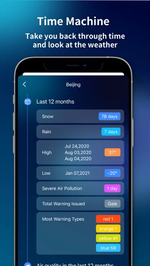 What was the temperature today last week? How many times did it rain last year? How many days are there heavy air pollution? Time machine takes you through weather data from the past.