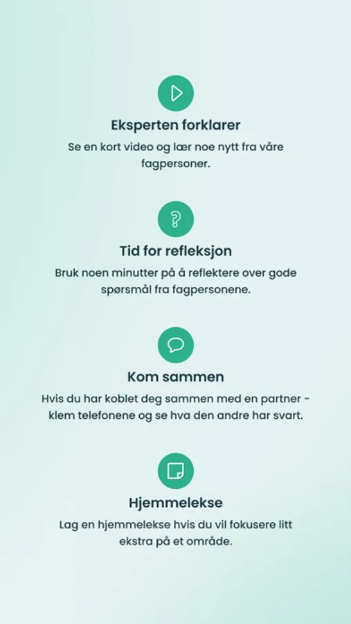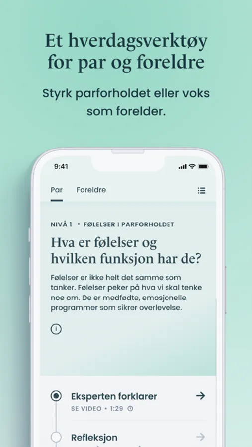 - Velg om du vil jobbe med parguiden, foreldreguiden eller begge. Appen er bygget opp av åtte nivåer, designet for å støtte deg over tid.